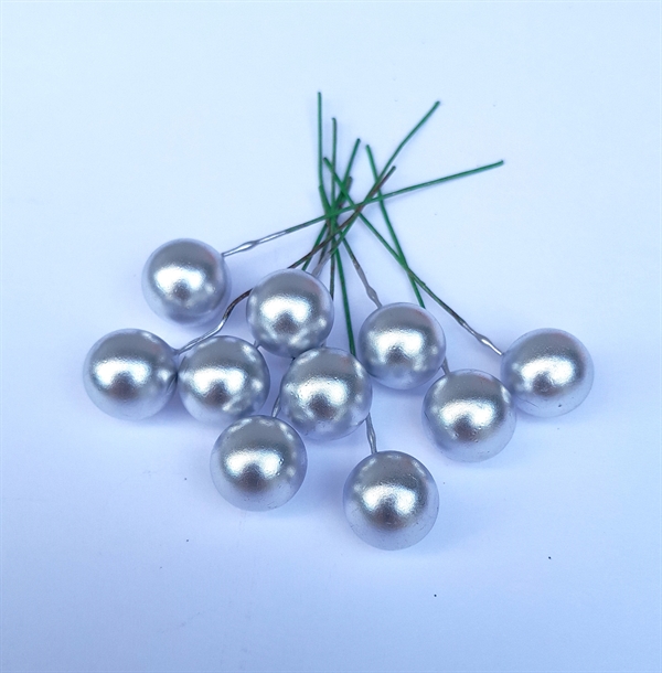 10 stk. dekorations bær på tråd. Sølvfarvede. Ø ca. 1 cm.