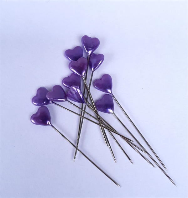 10 stk. Perlemor farvede lilla hjerter på nål.