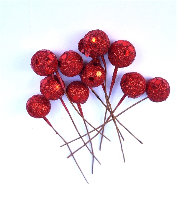 INFOKORT FOR : 10 stk. røde glitter dekorations bær på tråd ø ca. 1 cm.