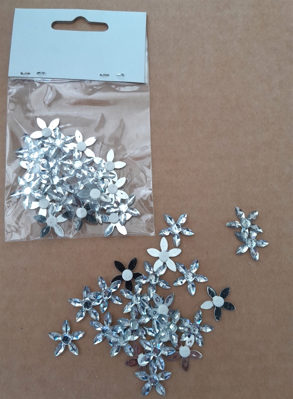 22-24 stk små Akryl blomster. Klæbepude på bagsiden.Ø ca. 0,8 cm.