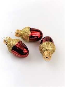 3 stk. Glaskugler med form som agern. Klar rød med guld. Højde ca. 5 cm.