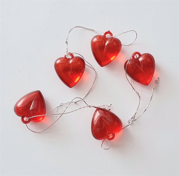 5 stk. Akryl røde hjerter med tråd. Ca. 2 cm. Tykkelse ca 1 cm.
