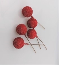 6 Stk. Røde dekorations bær på tråd. Ø på bærrene ca. 1 cm. Frost / sukker look.