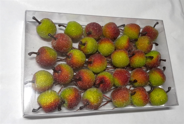 Æske med 26 til 29 små kunstige dekorations æbler Frost / sukker , på tråd . Ø ca. 2 cm.