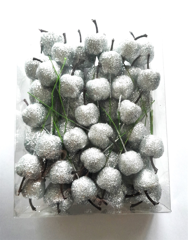 INFOKORT FOR : Æske med ca. 48 stk. sølv glitter dekorations æbler på tråd. I 2 størrelser