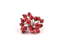 INFOKORT FOR : Bundt med dekorations bær. rød frost / sukker. Ca. 18 bær på tråd. Bærene måler ca. 1 cm.