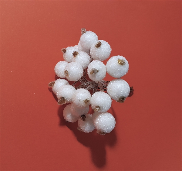 INFOKORT FOR : Bundt med dekorations bær. Hvide frost / sukker. Ca. 18 bær på tråd. Bær måler ca. 1 cm.