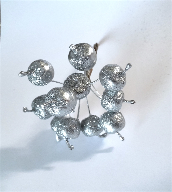 Dekorations bær / æbler med sølv glimmer. Ø på bær ca. 2 cm.ca. 10 stk. i et bundt.