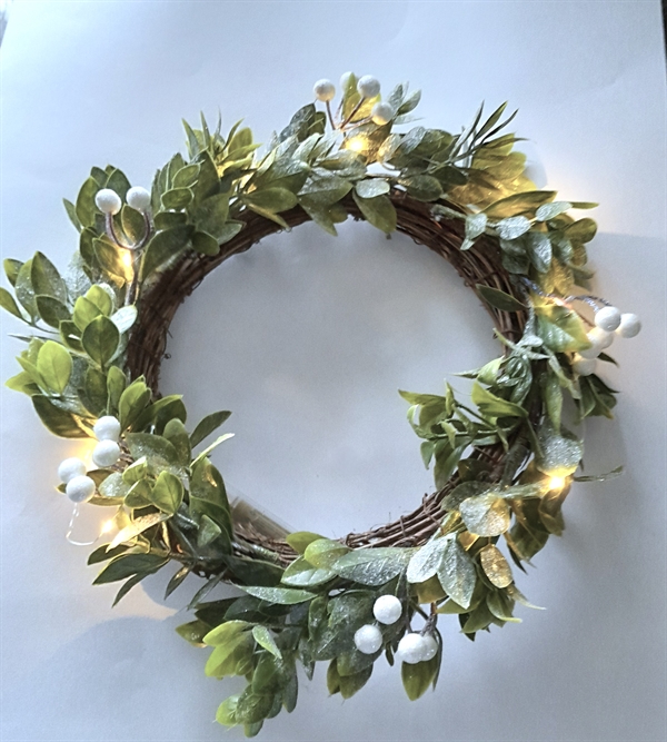 Dekorations krans med kunstige bær og blade med lys i kransen. Bruger batteri 2 stk. AA. Ø ca. 32 cm.