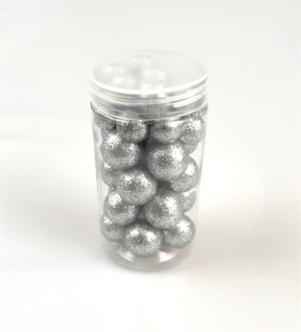 Glitter sølv kugler. i 2 varianter. Fine som pynt i dekorationer m.m. Meget lette.