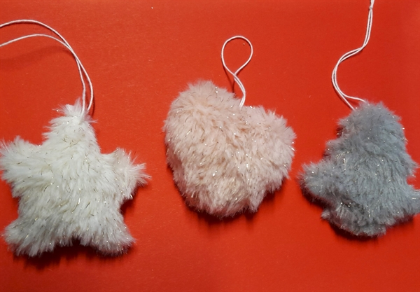 Hjerte, juletræ og stjerne i plys. med glimmer. Ca. ø 8 cm. Tykkelse ca. 3 cm. For ophængning.