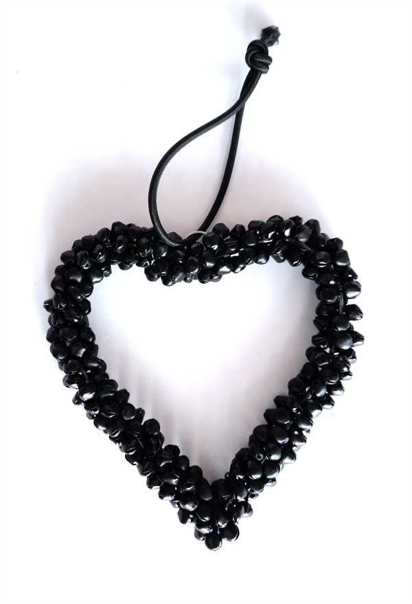 Hjerte med mange små sorte bjælder. Ø ca. 14 cm. Med snør for ophængning.