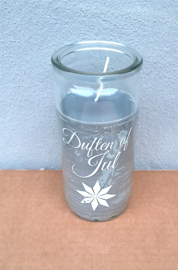 Lys i glas. Duftlys. Tekst. Duften af jul. H. 14 cm. ø 6 cm.