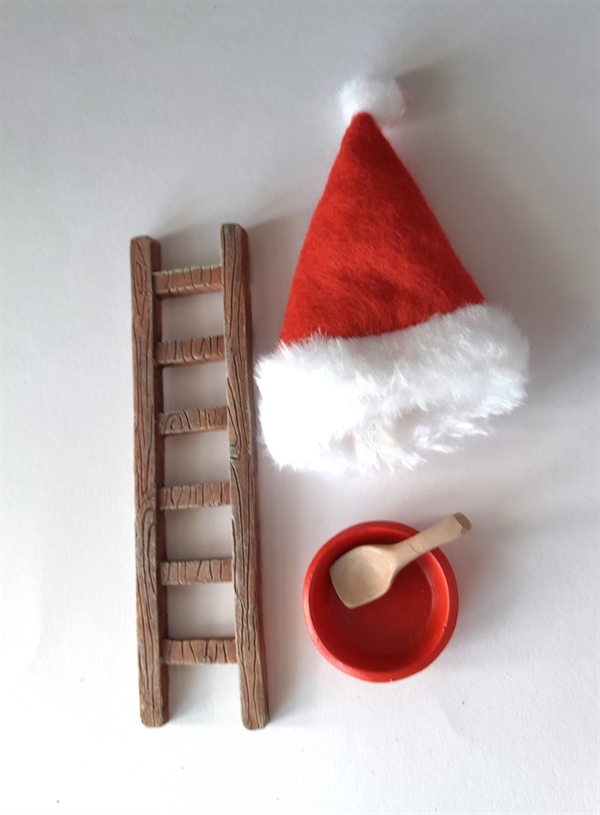 Sæt med nisse tilbehør. Stige, Nissehue og fad med ske. Når nissen flytter ind.