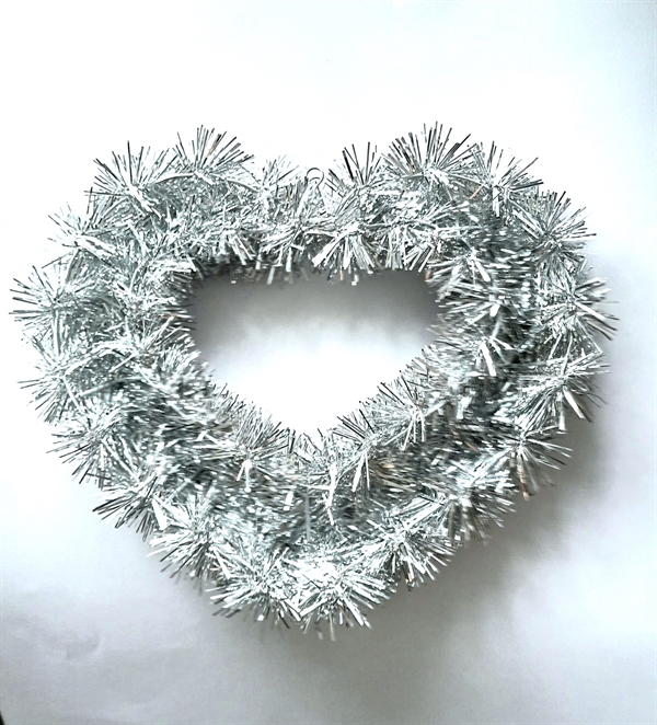 INFOKORT FOR : Sølv Lametta hjerte. Evt. for ophængning. Ø ca.26 cm.